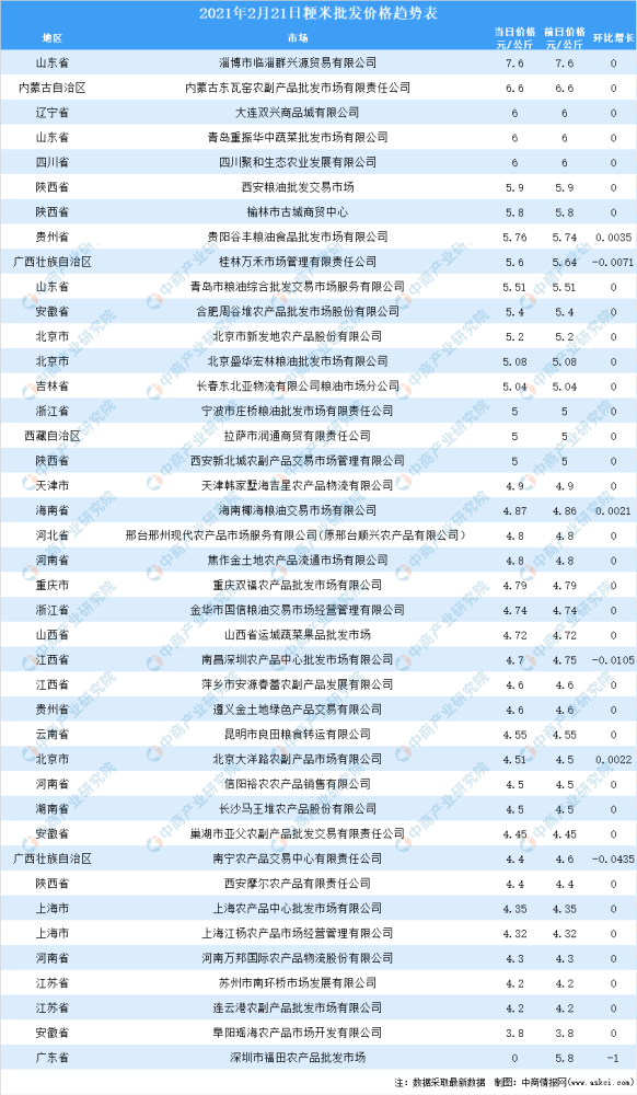 最新数据显示:2月21日全国大米价格走势与前一日持平。其中,粳米当日均价为4.89元/公斤,籼米当日均价为4.59元/公斤。其中,粳米价格最高的市场是位于山东的内淄博市临淄群兴源贸易有限公司,当日价格为7.6元/公斤,环比持平。籼米价格最高的市场是位于北京的北京市新发地农产品股份有限公司,当日价格为6元/公斤,环比持平。