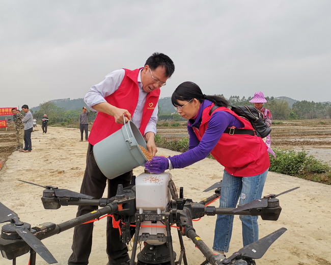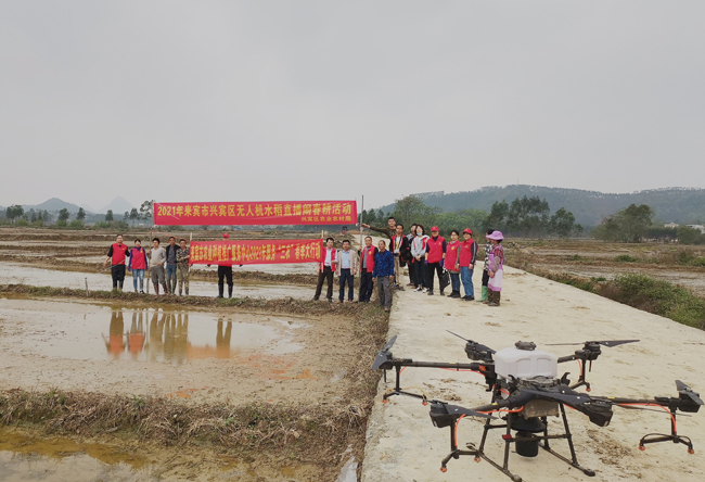 图为2021年兴宾区无人机水稻直播现场