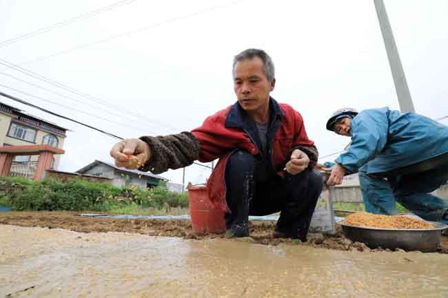 在广西柳州市融安县长安镇大巷村,农民在田间育秧。