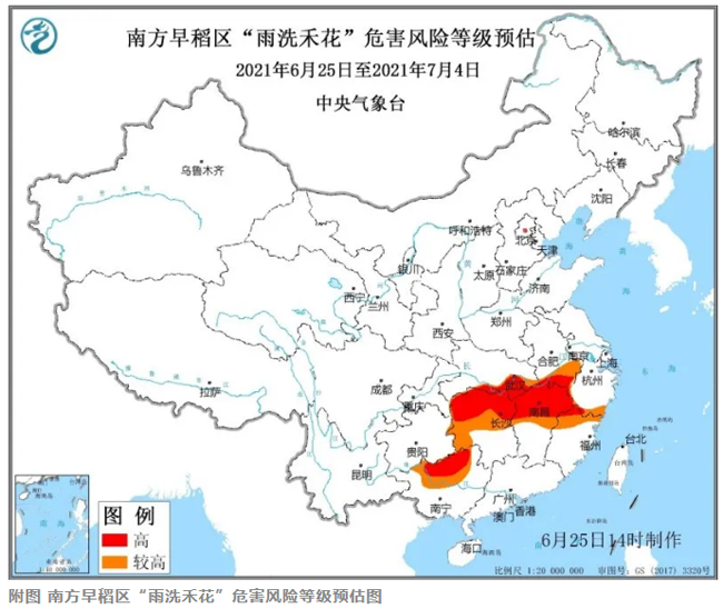 频繁暴雨天气对早稻抽穗扬花和病虫害防治不利,易造成正值抽穗扬花期的早稻“雨洗禾花”,影响授粉结实,特别是湖南北部、江西北部、广西西北部遭受“雨洗禾花”危害风险等级高(附图)。