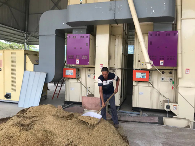 在马光元的稻谷烘焙车间,一个有13米高的大型稻谷烘焙设备正在作业,2名农妇正在将车辆送来的刚收割的稻谷,通过传送带送入烘干机。据介绍,该烘干机一天可烘干稻谷40吨。