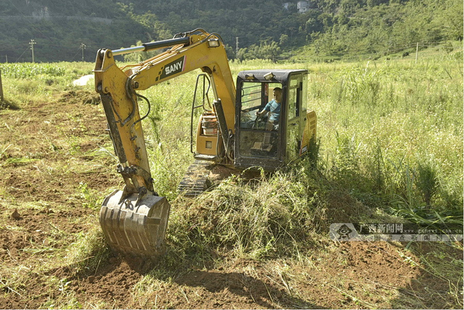 大化六也乡弄茶村弄茶屯工作人员在用钩机铲除杂草。