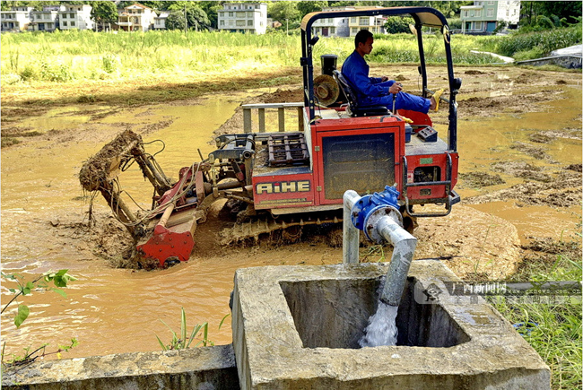 在弄茶屯的另一头,笔者看到,“旱改水”工程还在进行中,在一块地里,钩机在铲除杂草。在另一块田的边上,一条水管将从溶洞里抽出的清水灌入新修的渠道里,水从渠道设置的口子涌进田里。打浆机一面翻犁一面将杂草和表泥成打浆。