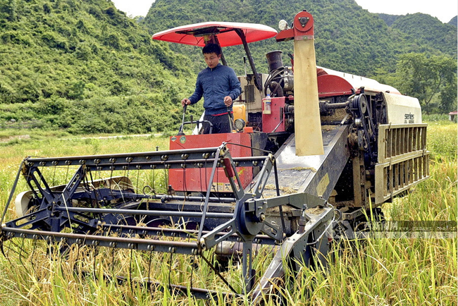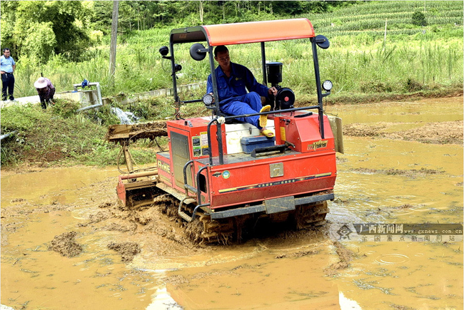 大化六也乡华善村列下工作人员在用收割机收割稻谷。
