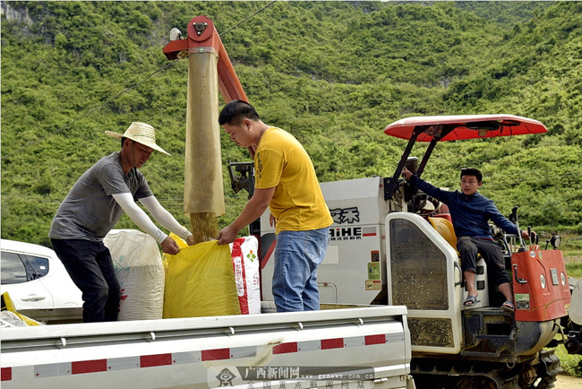 大化六也乡华善村列下屯工作人员将收割的稻谷装到袋里。