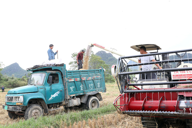 近日,在百朋镇小山村大相屯,柳江区2021年粮食高产创建示范基地里沉甸甸的稻穗压弯了腰。金黄色的稻田里,大型收割机忙碌穿梭“一吞一吐”,脱粒后的稻谷从收割机中快速输出,不一会儿便堆成一座小山,一辆辆满载稻谷的运输车在田间地头奔跑着……