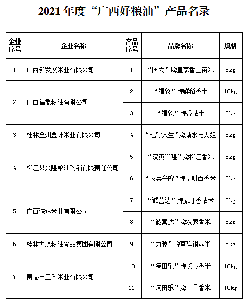 近日,自治区粮食和物资储备局组织开展2021年度“广西好粮油”产品遴选,全区粮油加工企业积极参加,37家企业申报,广西“中国好粮油”产品遴选专家委员会评审,最终确定广西新发展米业有限公司等7家企业11个产品为2021年度“广西好粮油”产品,有效期三年。