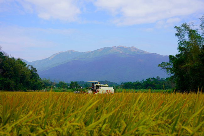 近日,阳光灿烂,伴随着水稻收割机的轰隆声,防城港市防城区那梭镇滩浪村的百亩水稻田喜迎丰收。