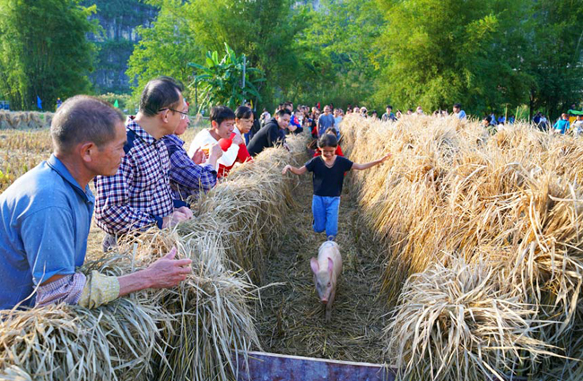摸鱼、赶猪、闻稻香……近日,一场独具特色的丰收节在广西大新县明仕旅游度假区举行,村民和游客们,通过参与赶猪摸鱼大赛、收割稻谷、品尝土味特色丰收宴等一系列趣味民俗活动,感受中越边境大新县独特的地道风物、灿烂的农耕文化和八桂壮乡丰收的喜悦。