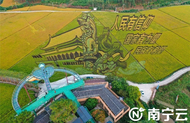 登上大陆村的观景平台,一幅礼赞新中国华诞的巨型画作便映入眼帘,目之所及,皆是美景。以田地为“画纸”,以水稻为“颜料”,“稻田画”色彩靓丽,图案清晰,再配上“人民有信仰、民族有希望、国家有力量”的文字,展示了宾阳人民对庆祝中国共产党建党100周年、喜迎中华人民共和国72岁华诞的美好祝福和奋发向上推进乡村振兴的必胜决心。值得一提的是,随着稻子逐渐成熟,稻田画由绿转黄,不断变换“马甲”,整个视觉盛宴可以维持两三个月。 在大陆村,除了网红玻璃桥,还有高空索道、彩虹滑道等项目也先后建成并对外开放。据统计,仅今年国庆假期期间,大陆村就迎接了游客18多万人次,村集体收入超过280万元。“目前,村里面打算在现有基础设施上,增加一些儿童游玩设施及水上游玩设施,在第二产业上,我们打算做古辣‘稻花香八宝’健康食品加工项目,第三产业,则打算对接社会上一些研学、户外拓展机构,将古辣镇作为培训点来打造,开展农耕研学课程。”古辣镇大陆村村支书韦学明对于村里未来的发展,感到信心满满。