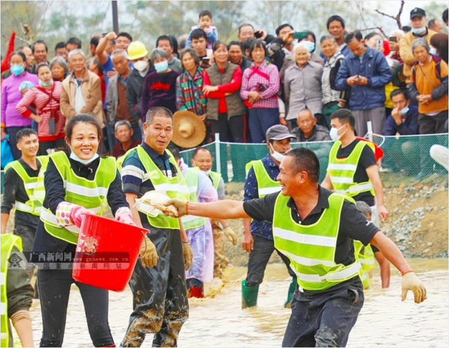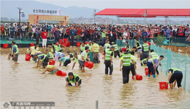 民众积极参加体验“浑水摸鱼”乐趣活动。