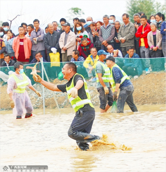 一名参赛群众兴奋地欢呼:“我抓到一条鱼啦!”