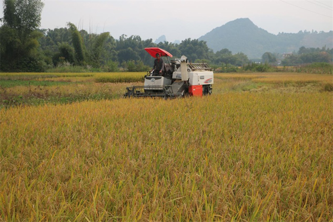 “哒哒哒……”连日来,在桂林平乐县张家镇田间地头,村民们正在利用收割机抢收水稻。张家镇张家村、老埠村、湴田等各村水稻收割现场,稻浪翻滚,一台台联合收割机来回穿梭。沉甸甸的稻穗随风摇曳,掀起层层金色的稻浪,处处呈现喜人的丰收景象。