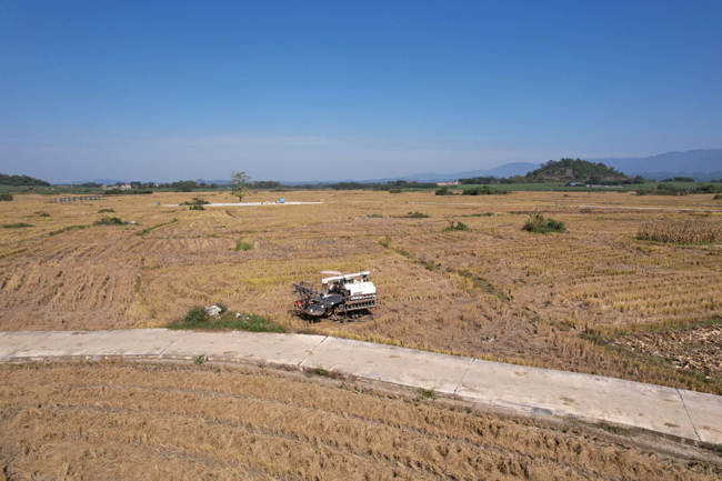 陆斡镇忠党村棉球屯稻谷收割机。