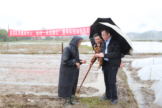 图为“春耕一线党旗红”服务队专家现场指导农户耕种