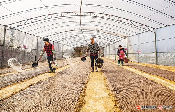 在日光温室育苗大棚内,工人正往秧盆里洒水,保证种子生长湿度。