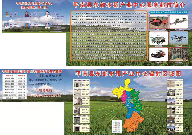 平南县东部水稻产业中心建成“一中心八区域”和推行“1+8”服务,实现水稻从耕、种、植保、收、烘、加工等全程机械化服务,以及为群众提供农情信息咨询、集中采购种子、化肥、农药等服务。
