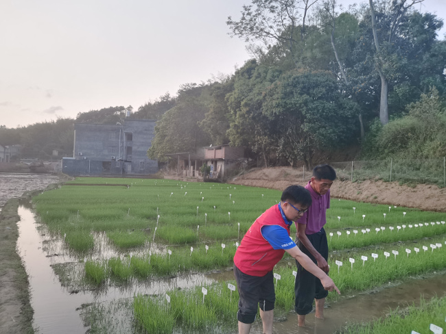 2022年3月21日,岑溪市梨木镇推广站站长,乡村振兴科技特派员韦彦到广西农业科学院水稻研究所稻瘟病鉴定圃检查早造水稻秧苗生长情况。