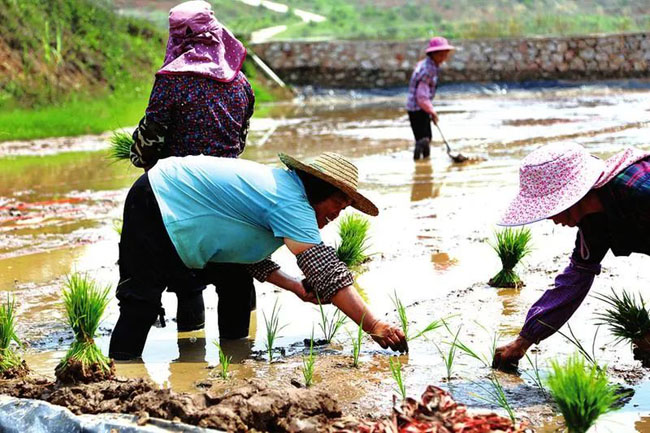 村民在世塬生态稻鱼养殖基地插秧