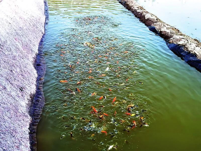 那楼镇那利村水稻田旁的水渠里新投放的鱼苗,待秧苗播种后将进入稻田与水稻共成长