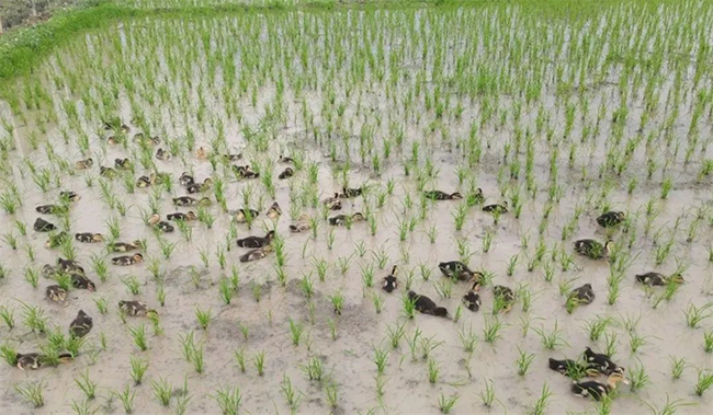 稻鸭共养是一种生态种养模式。一方面,鸭子属于杂食性,稻虫会被鸭子吃掉,鸭粪又是自然肥料,可以适当减少化肥和农药的使用。另一方面,鸭子的嘴到处在田里面啄食,小草基本上就长不起来了,已经成长起来的禾苗却不受影响。这样既能生产出优质的绿色稻米,还能提供生态土鸭,在节省人工除草除虫施肥费用的同时,还能提升土地利用率,提高经济效益。