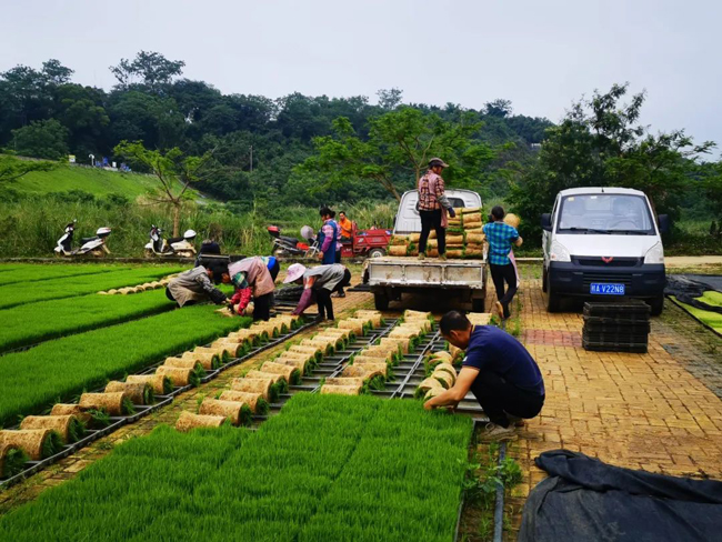 在忠党村丰收广场,整齐码放了大片机械插秧专用秧盘,秧苗长势喜人,工人们正忙着将育好的秧苗整理装车运往田间。在驻村第一书记的组织下,忠党村集体合作社与广西武鸣农家香米有限公司合作开展机插专用秧盘集中育秧技术推广。