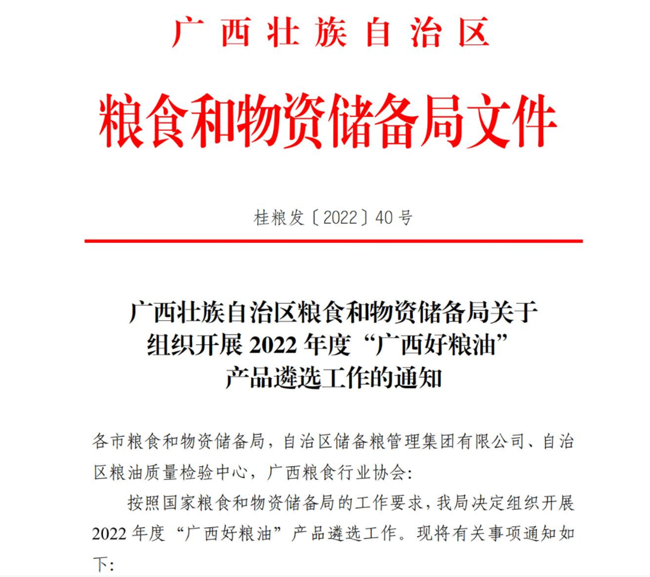 广西农牧大米网讯 近日,广西壮族自治区粮食和物资储备局启动2022年度“广西好粮油”产品遴选工作。据悉,“广西好粮油产品”的评选是广西壮族自治区粮食和物资储备局扎实推进“中国好粮油”行动计划、提高广西绿色优质粮油产品供给水平的一项举措。