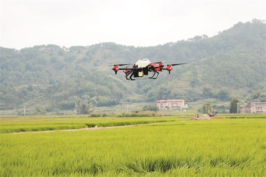 大型植保农药无人机在木格镇农田上空进行喷药作业。
