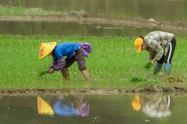 群众在田间插秧劳作
