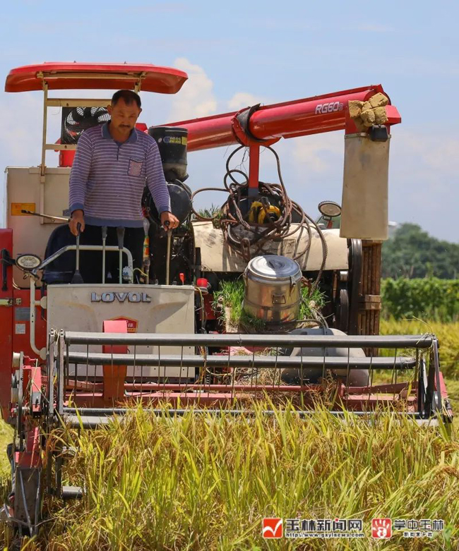 7月9日,记者在玉州区仁东镇木根村看到,4000多亩稻田呈现一片金黄,饱满的谷粒挂满稻秆,多台收割机忙碌地穿梭其中,轰鸣声奏响了丰收之歌。据悉,上半年全市早稻种植面积174.78万亩,同比增长2.5%,完成自治区任务102.4%。