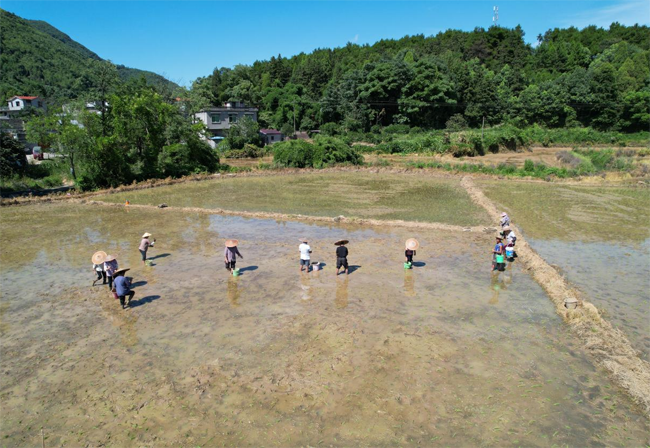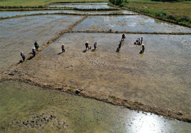 农民在收割后的稻田里抛秧种植晚稻