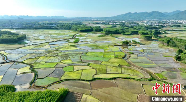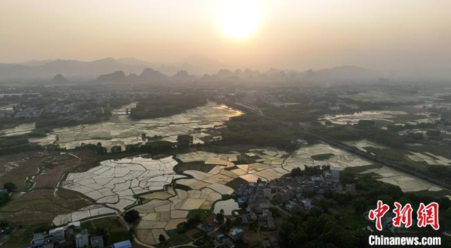 夕阳西下,富硒米稻田与周边的村庄、山林、河流等构成一幅美丽的山水画卷。