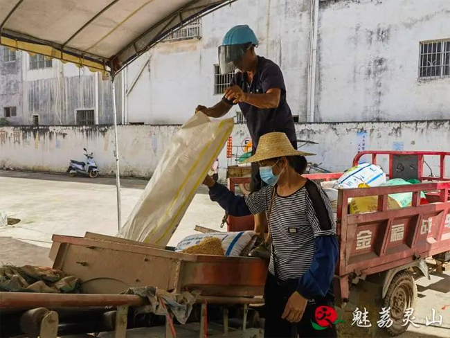 近日,在灵山县沙坪镇粮所大院内,一辆辆满载稻谷的农用车正排队等待收购,工作人员扯着嗓子,在现场指挥农用车检验、过磅、入库、结算,收粮车来回穿梭,倾倒稻谷,各道程序井然有序进行。为保证高质量验收稻谷,粮食库里转盘机、接收机、输送机、除杂机等设备高速运转,奏唱出美妙的“丰收之歌”。“我今年承包别人的地,种了4亩田,家里年轻人都出去打工了,我们两老也吃不了这么多粮食,听见村委说粮所正在收粮,价格也不错,我就和老婆子拉出来卖了。”陈阿伯用手擦了擦额头的汗说。