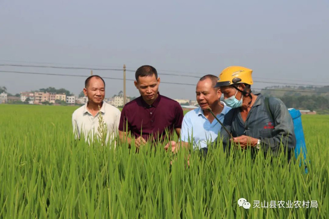 当前正值晚稻抽穗结实期,灵山县农业农村部门组织农技人员深入田间地头,查看苗情、墒情,现场开展分类技术指导与服务,持续做好病虫害监测防治工作,全力夺取秋粮和全年粮食丰收。