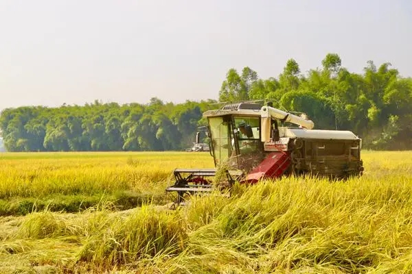 近日,广西农投乡投公司在贺州市铺门镇鹤洲村举行水稻收割活动。