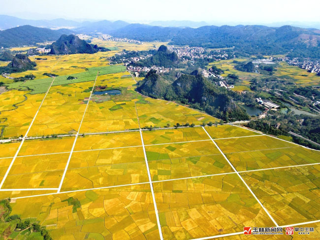 兴业县金谷水稻产业核心示范区,金黄色的稻田好似清新淡雅的田园风光画,美不胜收。 (庞华民 摄)