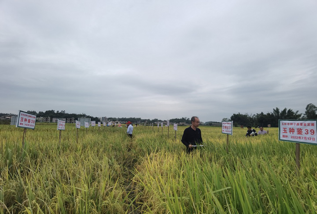 2022年10月20日,玉林市种子工作站组织玉林市各县(市、区)种子部门负责人和技术人员到陆川县马坡镇硃砂村对玉林市2022年晚造水稻种子质量鉴定圃种植的水稻种子样本进行田间纯度鉴定,并对所有种植品种(共55个)抽取20片叶子带回实验室进行转基因检测。