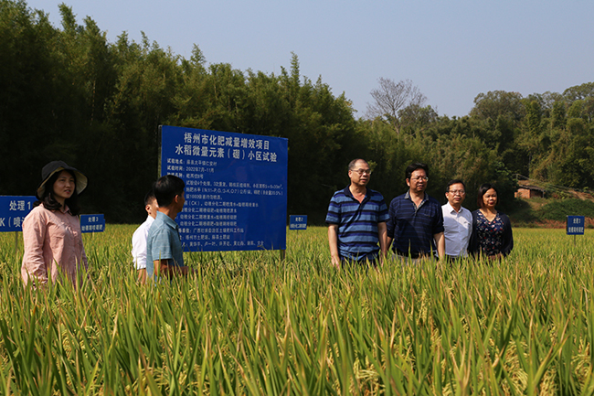 调研组来到藤县太平镇仁安村化肥减量增效项目点进行实地调研。在现场,调研组听取了藤县土肥站工作人员对项目实施情况的相关介绍,并仔细对比了化肥减量不同的小区田块水稻生产情况。