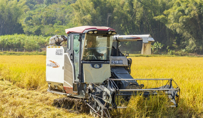 近日,位于南宁市青秀区长塘镇的中国—东盟稻作文化产业园迎来丰收时节。近300亩的水稻颗粒饱满,呈现出金黄的色泽,收割机忙碌地穿梭在稻田间,一派繁忙的丰收景象。