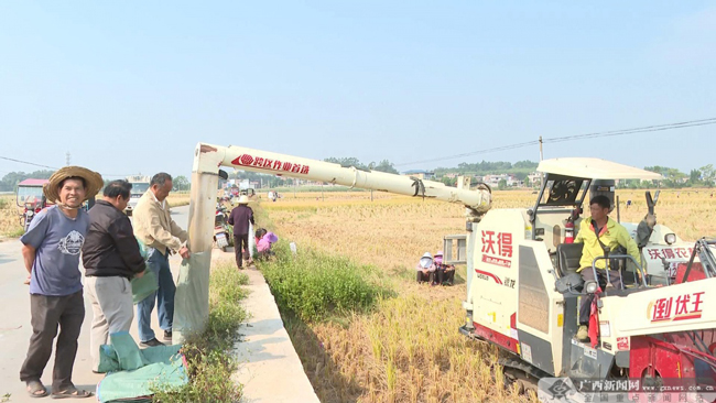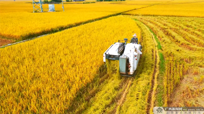 近段时间以来,南宁市宾阳县广大农户趁着天气晴好,抓紧时间抢收稻谷,保障了粮食丰产丰收。