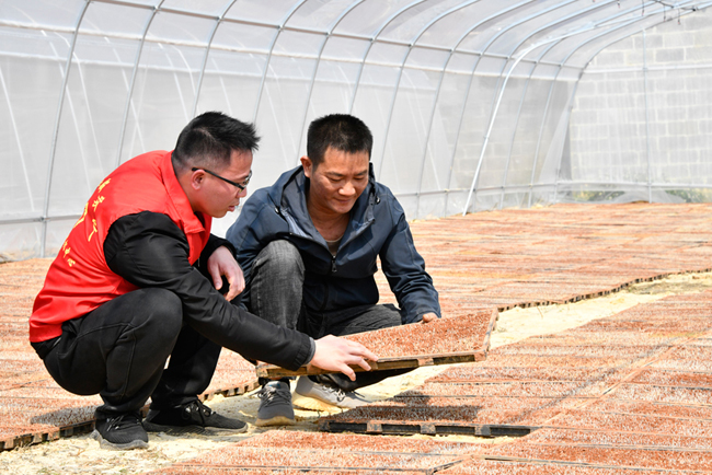 2月20日,在广西兴业县永润农业专业合作社联合社的育秧中心大棚里,工人们正在育秧播种流水线旁忙碌,一盘盘播种好的育秧盘成品源源不断从生产线上“诞生”后,再将其放进温室里进行催芽,大棚里一派繁忙的春播生产景象。