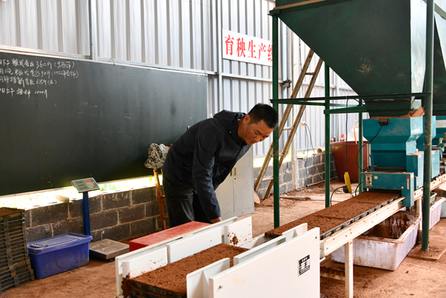 工人将生产线上“诞生”出来的育秧盘摆放整齐。兴业县融媒体中心供图