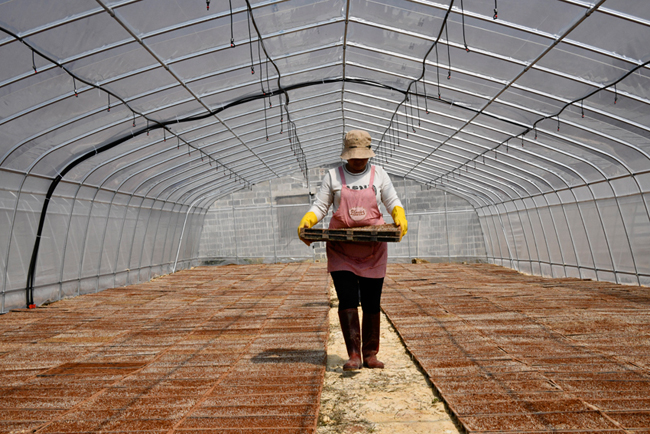 工作人员在大棚里搬运育秧盘。兴业县融媒体中心供图