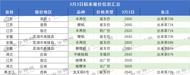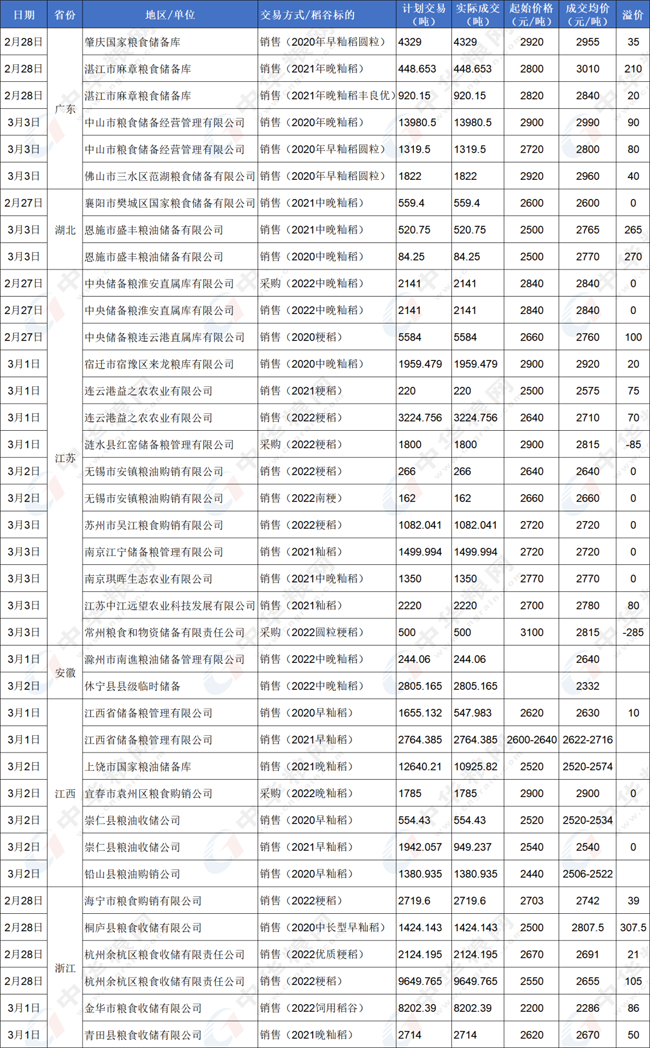 3月2日中储粮安徽分公司(芜湖)竞价销售2020、2021年中晚籼稻谷1470吨,全部成交,其中2021年粮源858吨,底价2700,成交价2760;2020年粮源612吨,底价2660,成交价2815,溢价155。