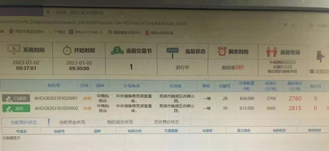 2月27日中储粮江苏分公司(南京库)竞价销售2020年产中晚籼稻4872吨,底价2780元/吨,全部成交。