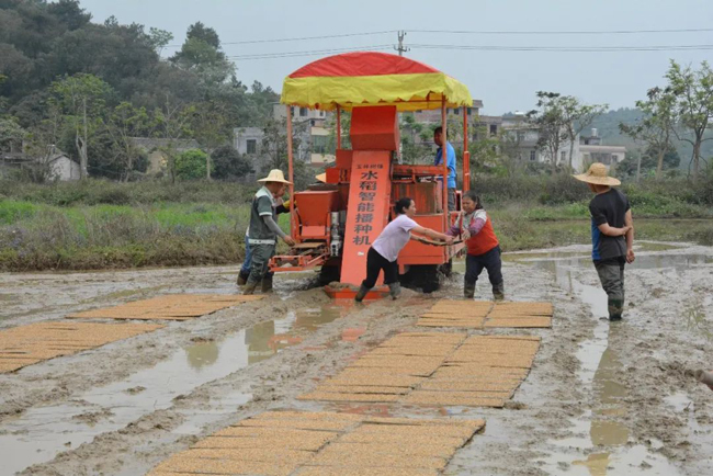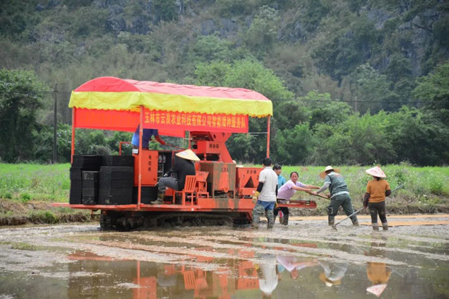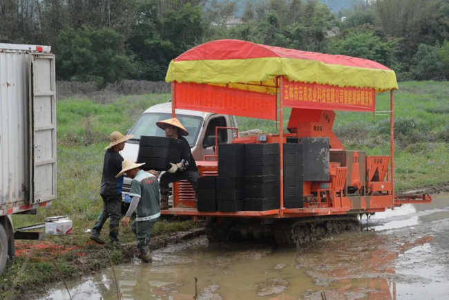 “这台水稻智能播种机实现了集放托盘、施壮秧剂、灌浆泥、浆泥除杂以及播种一体化,在人工辅助下,每分钟最多可完成30盘秧苗的播种,一天最多能够播种满足500亩大田水稻种植的秧苗量。”水稻智能播种机的研发者——广西玉林市树锋农业机械科技有限公司董事长罗学夫介绍,机械播种具有自动化程度高、播种速度快、使用方便、省时省力、安全环保等特点,相比于育秧工厂,还具有投资成本小、不受空间限制、不占空间、在农田就地取材(浆泥)等优势,对于稻谷生产实现机械化全产业链起到了重要作用。