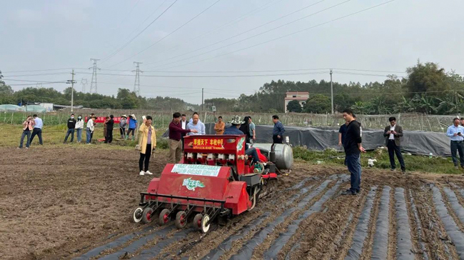 近日,记者在合浦县白沙镇水稻示范基地举行的水稻覆膜节水栽培技术现场观摩会看到,在机器的运作下,旋耕、开沟、施肥、浇水、播种、覆膜、盖土等环节一次性作业完成。短短几分钟时间,一行行水稻就已种植完毕。