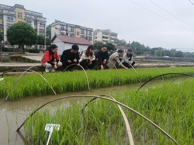 发展中心主任钟燕燕和副主任廖华明及项目负责人察看秧苗长势情况