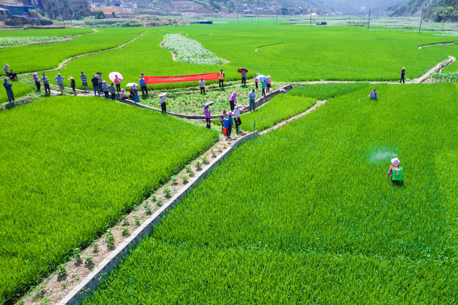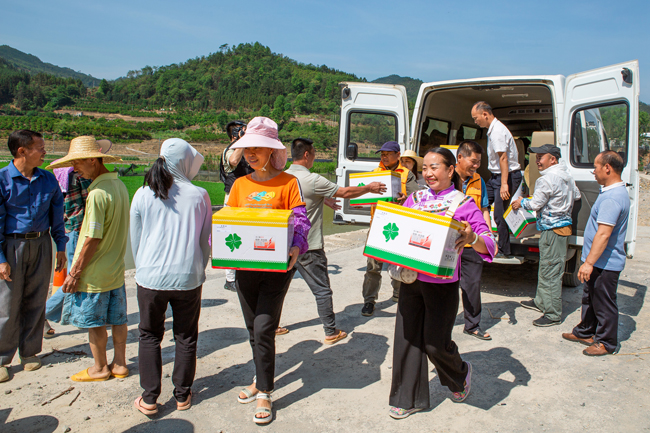 图为群众在领取水稻病虫害防控物资 李世华摄