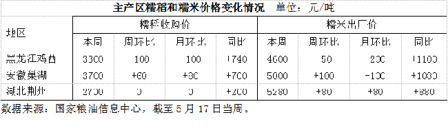 各级储备持续投放市场,粮源供应充裕。在已进行的8期最低收购价稻谷拍卖中,中晚籼稻均有成交,且数量保持在3.3万~7.6万吨,市场尤其关注质量较好的陈稻,在5月16日的拍卖中,中晚籼稻成交7.19万吨,其中江西、安徽产优质中晚籼稻成交溢价达60~130元/吨。